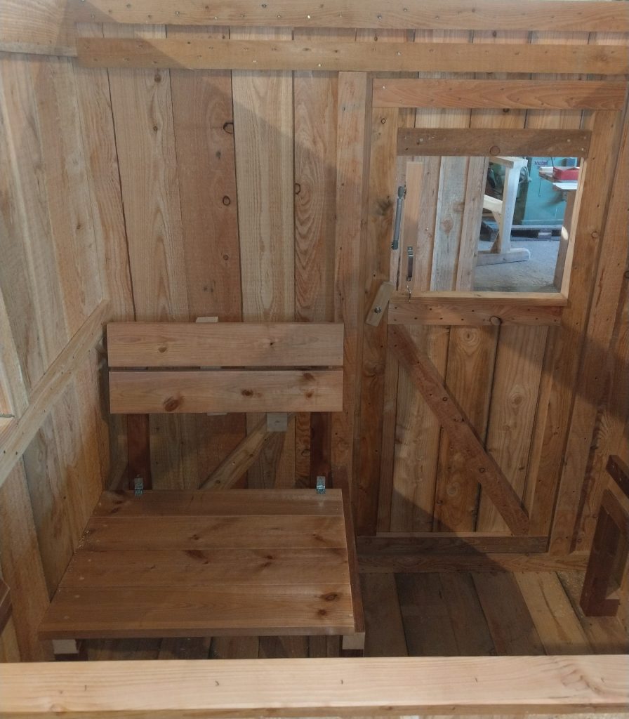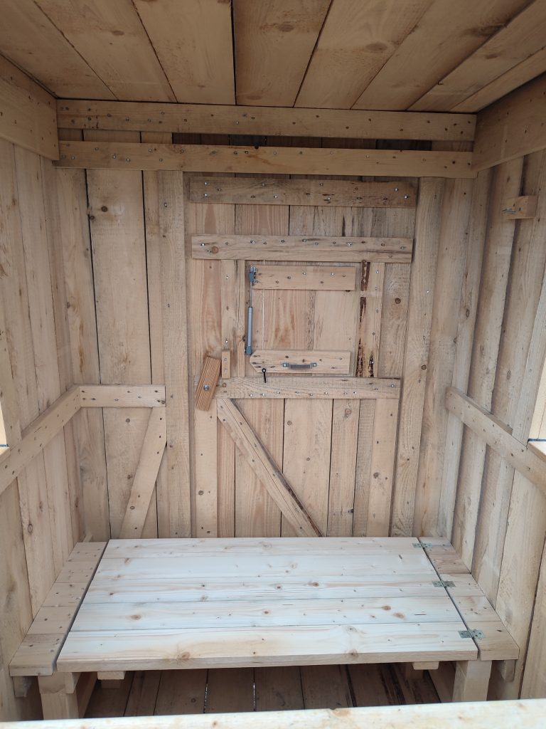 Durch eine halb offene und halb geschlossene Konstruktion hat diese Variante mindestens 180 Grad freies und offenes Schussfeld nach vorne und zur Seite, ohne dass dabei störende Eckpfosten das freie Schwingen der Waffe behindern.